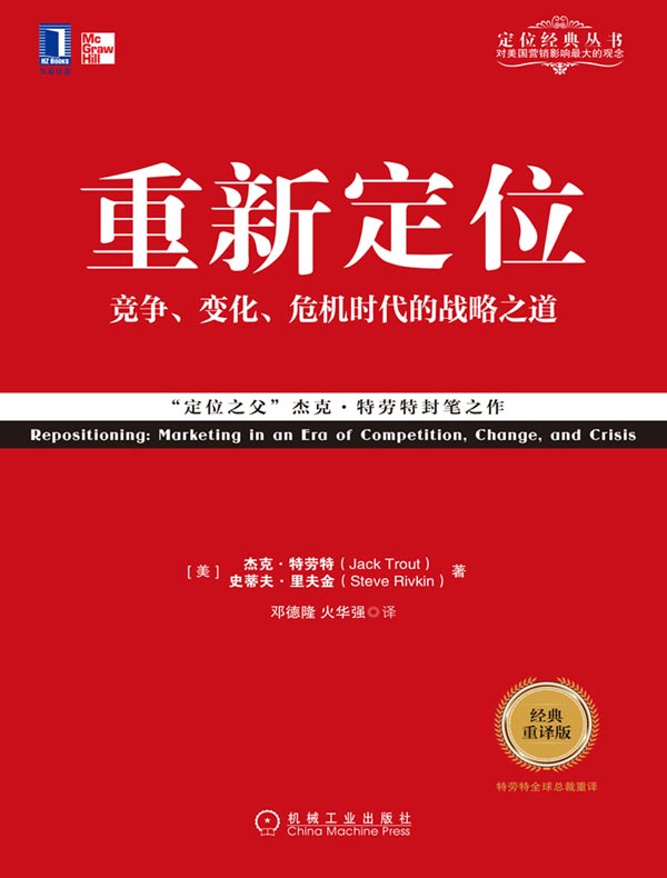 重新定位:应对竞争、变化与危机的战略营销之道,教你如何创造顾客,赢取高利润,时代变了,竞争更加激烈,消费者也更加精明,传播速度更加迅速,曾经成功的公司处于危机中。即使你的公司运营良好,这些先进的营销理念也是你的必需,它们可以让你在竞争中保持领先,在市场上处于不败之地。你会发现:为什么扩张产品线会减少你的总体销售量!为什么新品牌总比已有品牌销量多!为什么降价通常不是好方法!你会知道与对手正面交锋的危险和强调价值的价值。你会看到消费者的选择多得惊人,你能做的就是让他们选择你的品牌。