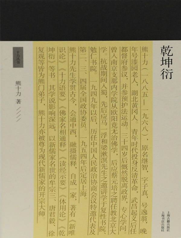 熊十力自述其哲学思想的演变轨迹,自佛教唯识学(有宗)入,进而探究空宗,后悟入《大易》体用不二之义。其1932年出版的《新唯识论》从唯识学脱胎而来;1958年出版《体用论》,乃从自我体系立论,不复借助唯识学的理论框架;1961年写成影印《乾坤衍》,是对于《易经》乾坤二卦大义的推演,一方面揭示自家思想的来源,重申其归本《大易》之意,一方面对于现存《周易》文本的不同思想来源作出分析评判。
